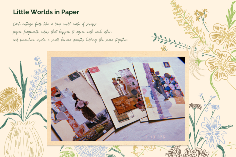 Each collage feels like a tiny world made of scraps—paper fragments, colors that happen to agree with each other,and somewhere inside, a small heroine quietly holding the scene together. This series came together in a very quiet, intuitive way. I…
