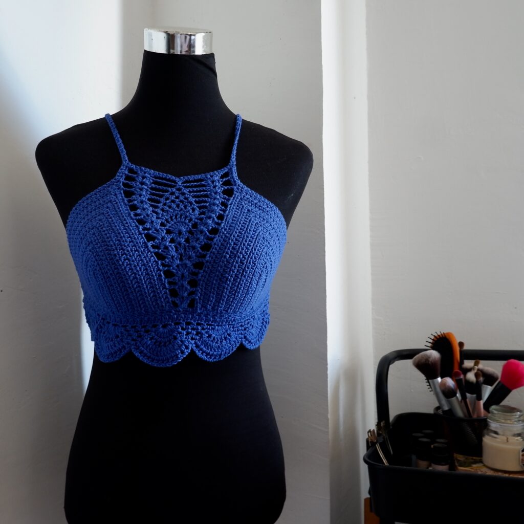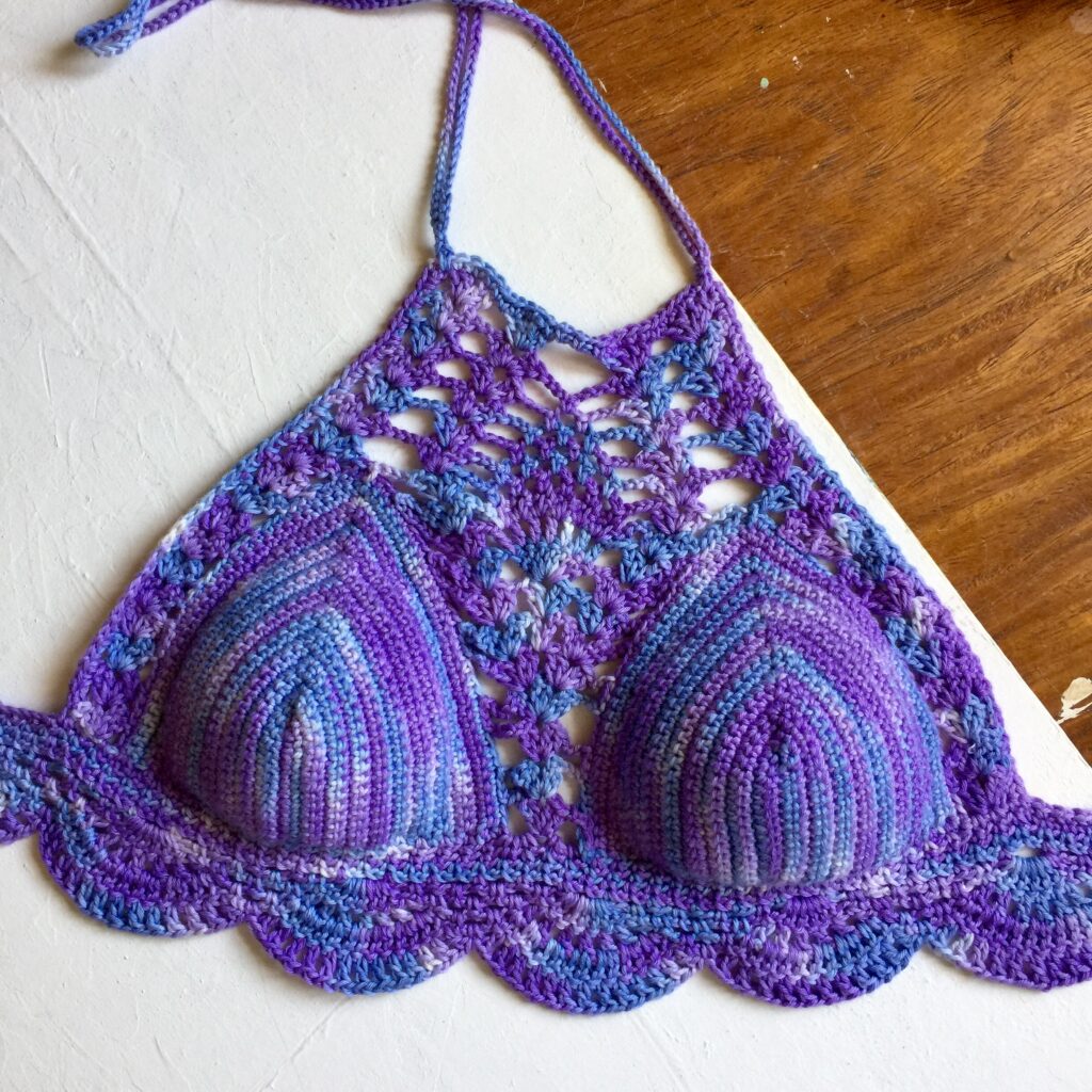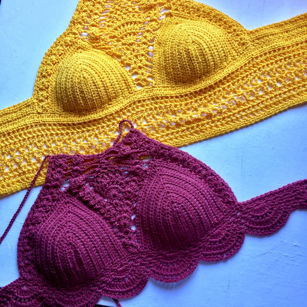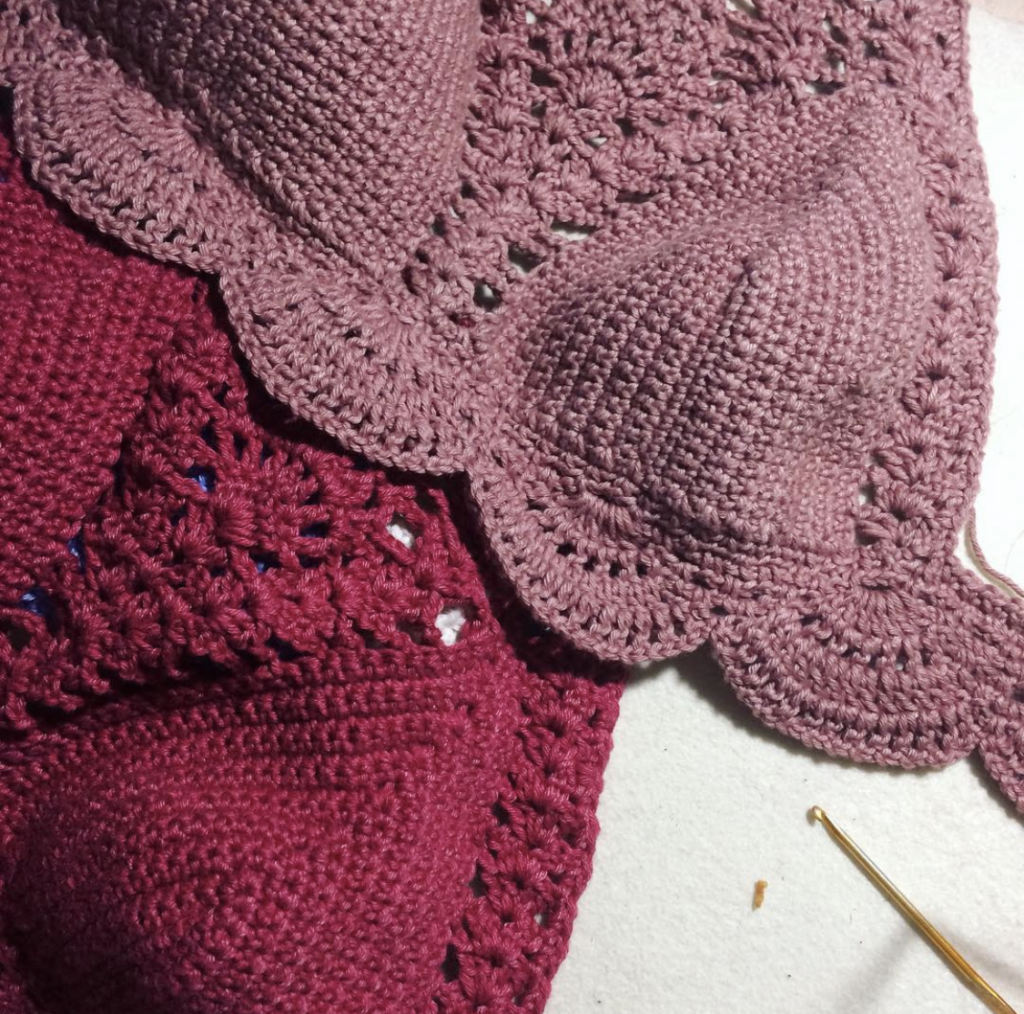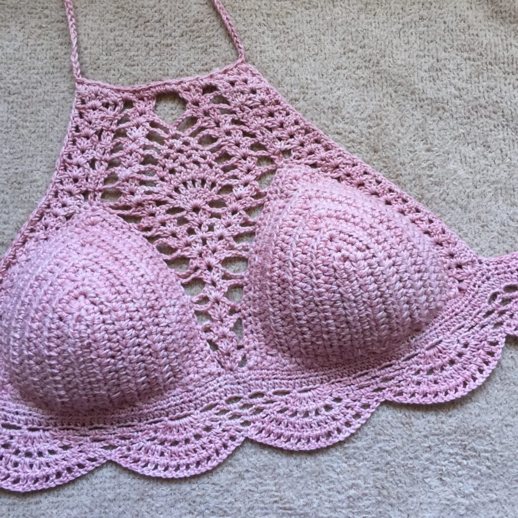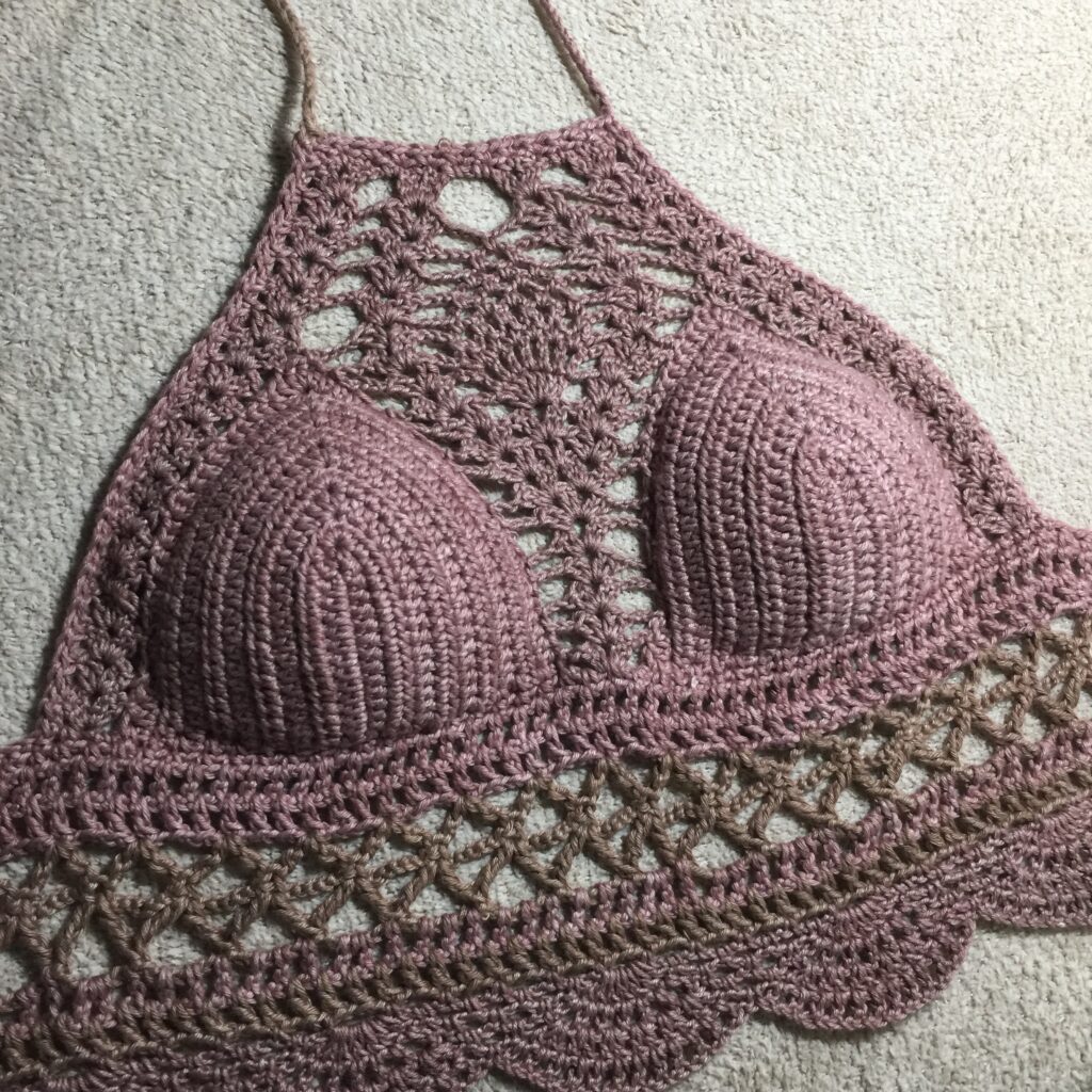 The pattern was from a YouTuber at the time. Her version used thicker yarn, and a I, however, decided to complicate my life and use fingering yarn. I double-pulled on the cups and used a single crochet stich. The cups took forever. But the pineapple stitch looked softer. More intricate.