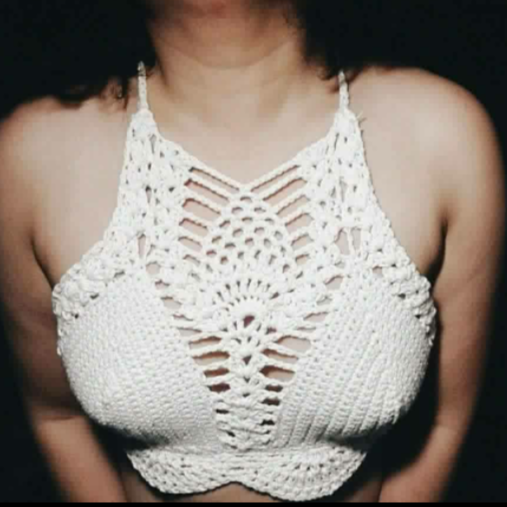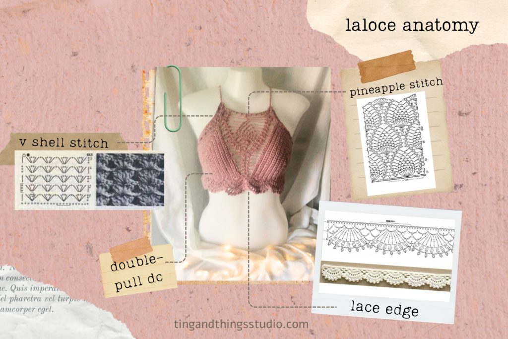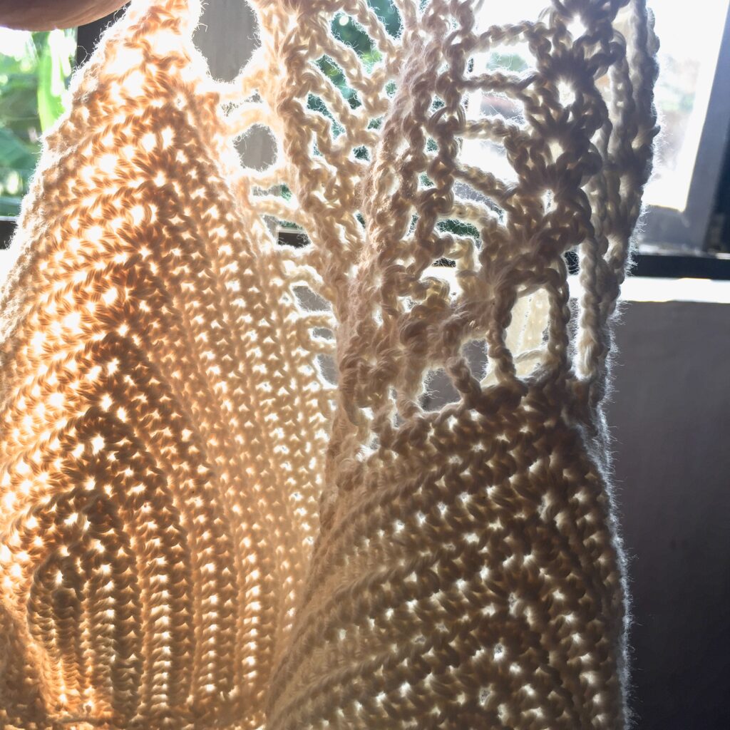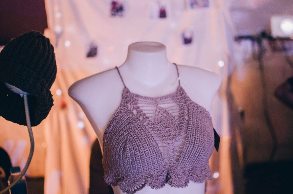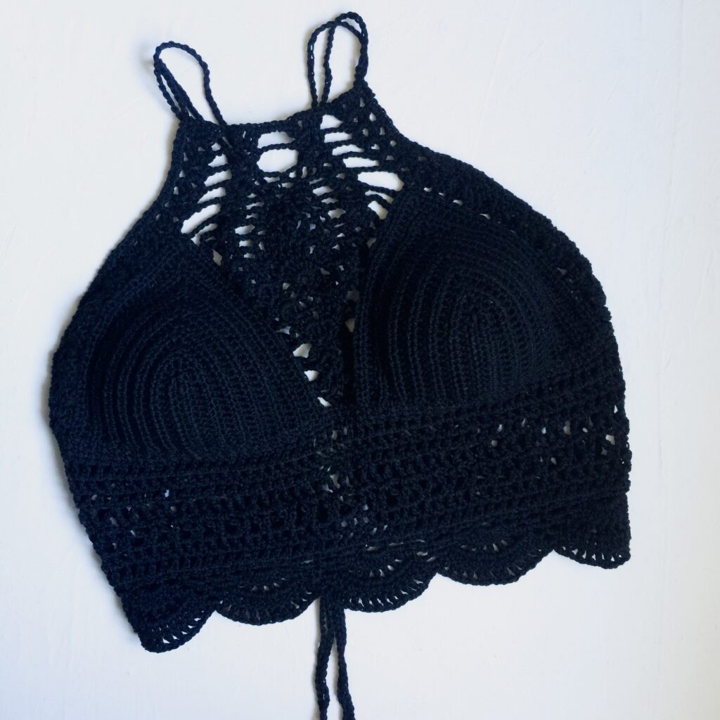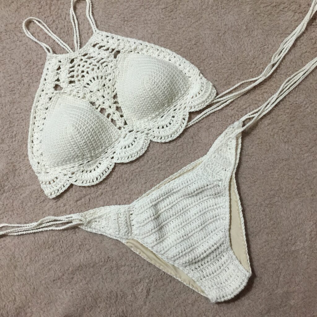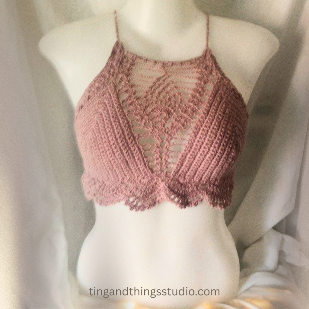 The pattern was from a YouTuber at the time. Her version used thicker yarn, and a I, however, decided to complicate my life and use fingering yarn. I double-pulled on the cups and used a single crochet stich. The cups took forever. But the pineapple stitch looked softer. More intricate.